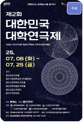 오는 7월 8일, 용인시에서 '제2회 대한민국 대학연극제'가 드디어 막을 올립니다! '대학연극, 르네상스를 꿈꾸다'라는 슬로건 아래, 전국의 대학 연극인들이 한자리에 모여 경계를 허물고 새로운 시도를 펼칠 예정인데요. 용인문화재단 주관으로 7월 25일까지 약 3주간 이어질 이번 축제는 젊은 연극인들의 열정과 창의성을 만날 수 있는 특별한 기회가 될 거예요.