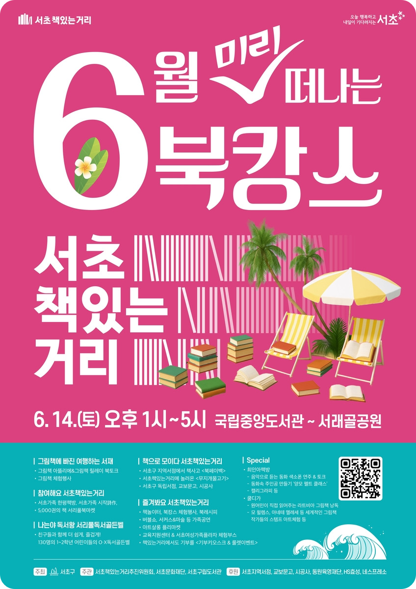 따사로운 햇살 가득한 6월, 다들 여름휴가 계획 세우고 계신가요? 🏖️ 아직이라면 서울 서초구에서 진행하는 특별한 행사에 주목해 보세요! 오는 6월 14일, 서초책있는거리에서 '6월 미리 떠나는 북캉스'가 열립니다. 지난 4월의 '북크닉'에 이어 올해 두 번째로 마련된 독서문화행사라고 해요.